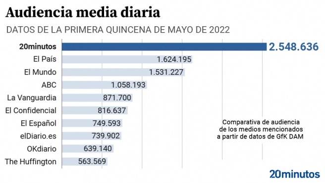 En cuanto a la audiencia media diaria, 20minutos sigue aumentando el número de lectores que cada día recibe de media a través de todos sus dispositivos y en los primeros quince días de mayo ha superado la barrera de los 2,5 millones de usuarios (2.548.636), por delante de El País (1.624.195) y El Mundo (1.531.227).