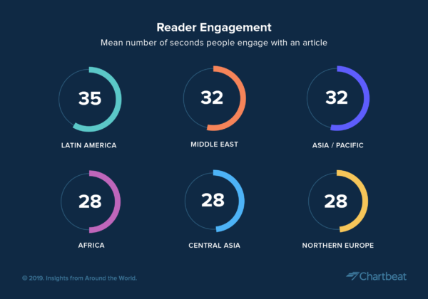 El engagement en América Latina (concretamente en términos de tiempo dedicado a la lectura de los artículos) encabeza las audiencias internacionales, según los resultados extraídos de la red de periódicos que usan Chartbeat, correspondiente al primer trimestre de 2019 (1Q), que acaba de publicar esta empresa de analítica.