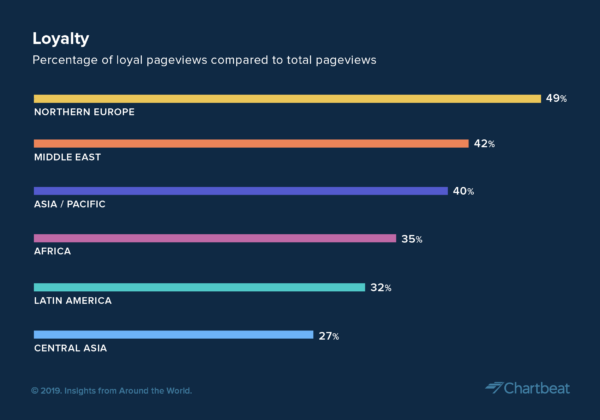 Dentro del apartado de comportamiento de los lectores leales (entendido como lector leal aquel que durante un periodo de dos semanas visita el periódico al menos la mitad de los días), Europa del Norte lidera el mercado en lo que atañe al ratio entre páginas vistas consumidas por lectores leales con respecto a todas las páginas vistas. Es decir, los lectores leales del Norte de Europa son los que más páginas vistas generan.