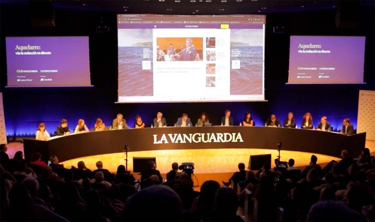 La Vanguardia organizó un evento exclusivo en el auditorio del CosmoCaixa, donde mostró a unos 300 de sus 150.000 suscriptores, seleccionados por sorteo, cómo se construye de verdad la portada del día siguiente, de la mano del director, Jordi Juan, y su equipo.