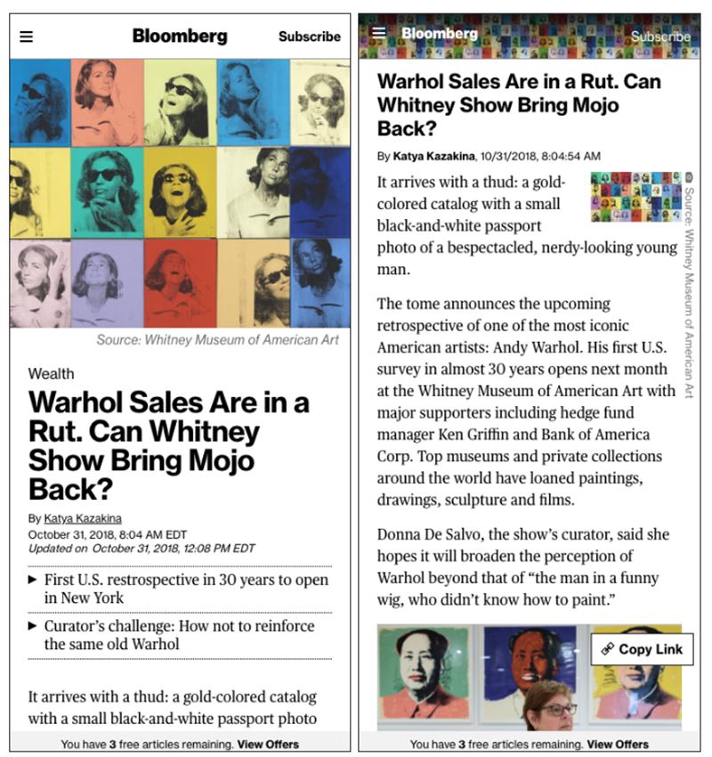 Con estos datos, Bloomberg se puso a diseñar una plantilla de artículo pensada específicamente para usuarios que acceden a un artículo vía redes sociales. La aplicación tiene estas características: