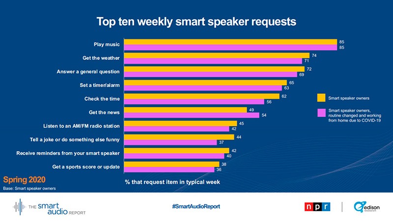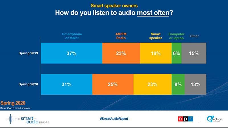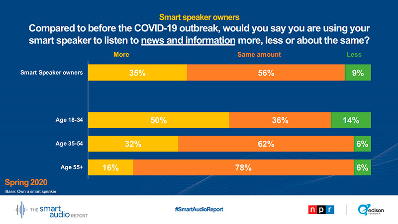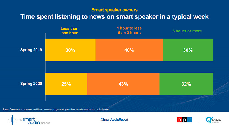 Un estudio de la NPR (radio pública) en EEUU ha revelado que el porcentaje de propietarios que usan ahora los altavoces inteligentes para oír noticias ha pasado del 55 al 62% de la primavera de 2019 a la de 2020. La encuesta se realizó el 31 de y 1 de abril de 2020.