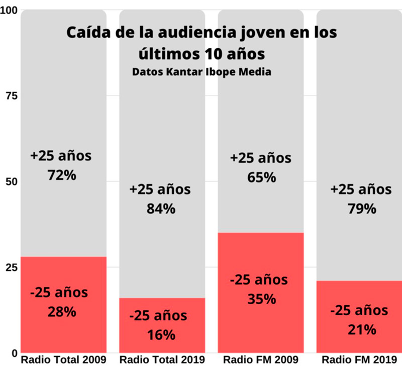 Por otro lado, la radio ya no atrae al público joven (menores de 30 años), que se vuelca más a contenidos generados en otras plataformas, como Instagram, YouTube o Spotify. Como reflejo de esto último, datos de 2009 indican que los oyentes de entre 12 y 24 años constituían el 28% de la audiencia general de la radio. En la FM, la participación de ese sector etario era del 35%. Diez años después, la participación de esa franja de oyentes es del 16% en el total del encendido y del 21% en la FM.