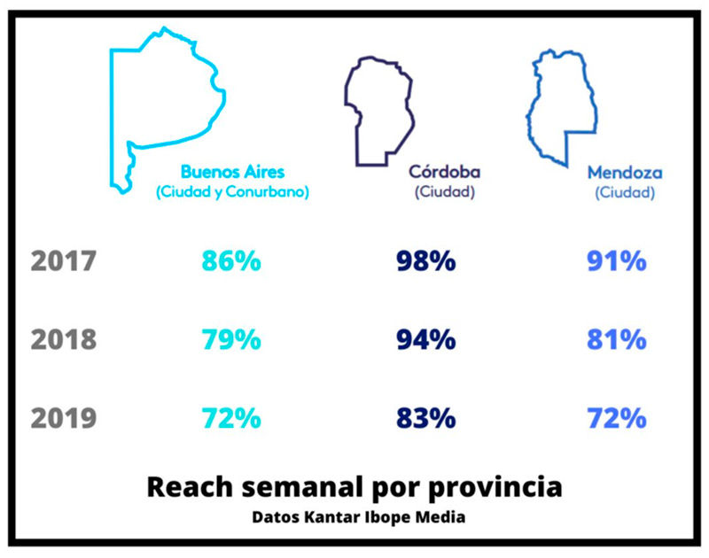 La penetración semanal de la radio dentro de la población analizada alcanza un 72% en Buenos Aires, lo que representa una caída del 14% en tan solo dos años. En Mendoza, la pérdida de oyentes es peor: del 91% en 2017, pasó a tener un alcance del 72%. Una situación similar se refleja en otro gran centro urbano como Córdoba: con un 83% de la población que escucha radio actualmente contra un 98% en 2017.