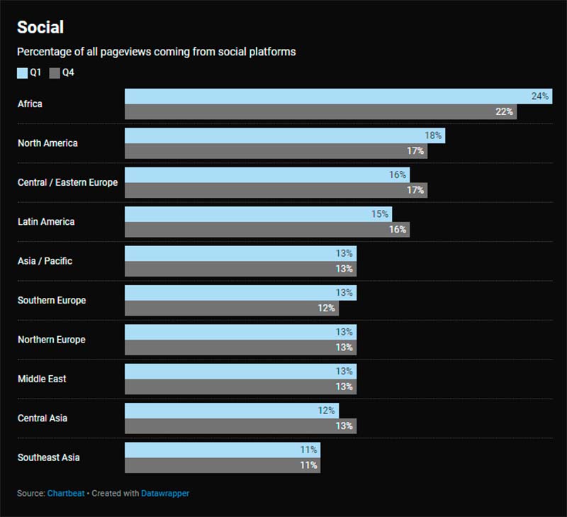 El tráfico procedente de motores de búsqueda disminuyó en Asia Central y África, mientras que las visitas desde redes sociales crecieron en África, América del Norte y Europa del Sur. En general, la lealtad de los lectores aumentó en África, Oriente Medio y Asia Central.