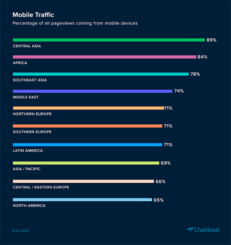 En concreto, en el tercer cuarto de 2021, en el área en la que está enclavada España en la clasificación de Chartbeat (Sur de Europa), el 74% de las páginas vistas totales de los medios de comunicación, de media, se habían generado a través de móviles. En el último cuarto, en lugar de crecer por la mayor movilidad tras los confinamientos, el porcentaje desciende hasta el 71%, un 3% de caída, que es la tónica general en muchos países. En el norte de Europa, cae menos, un 1%, pero también retrocede, y en Europa Central y del este, pasa del 68% al 66%.