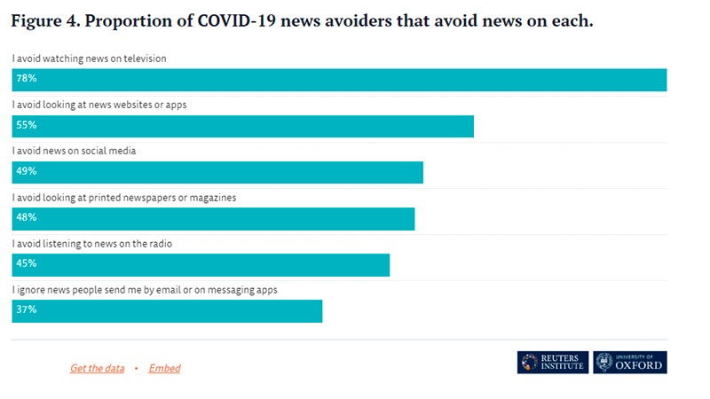 - La gran mayoría de aquellos que dicen que» siempre o a menudo» evitan las noticias (86%) esgrimen que actúan así para evitar las noticias de COVID-19, al menos algunas veces.