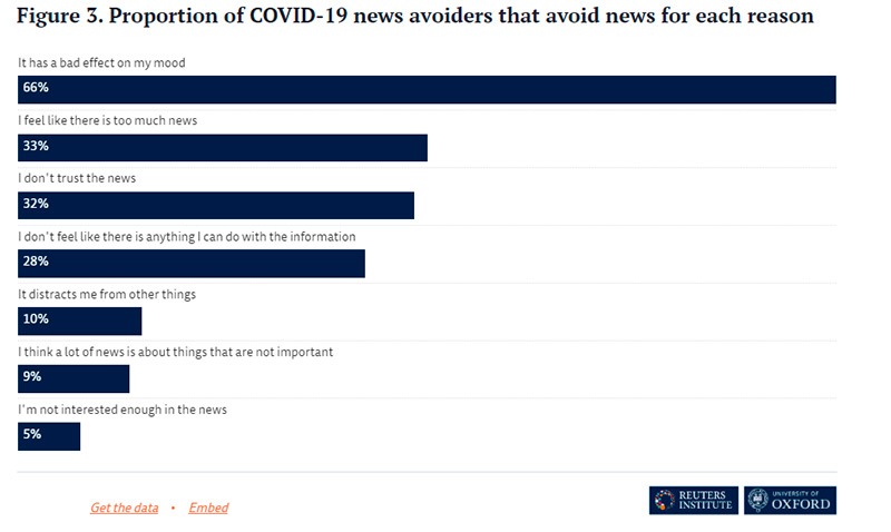 - La mayoría de ellos dijeron que están principalmente preocupados por el efecto que tiene en su estado de ánimo (66%). El 33% dice que siente que hay demasiadas noticias, y el 28% comenta que evita las noticias porque creen que no hay nada que puedan hacer con la información.
