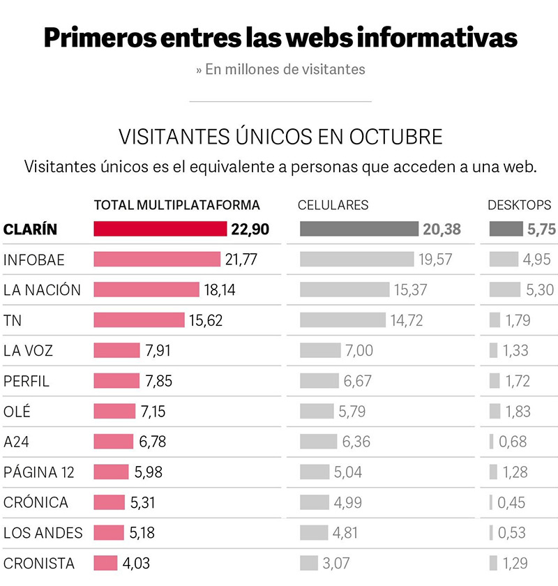 Con estos números, el sitio de noticias quedó ubicado en lo más alto de la tabla de los sitios informativos más visitados. Debajo de Clarín se ubicaron Infobae, La Nación, TN, La Voz de Córdoba, Perfil, Olé, A24, Página 12, Crónica, Los Andes de Mendoza y Cronista Comercial.