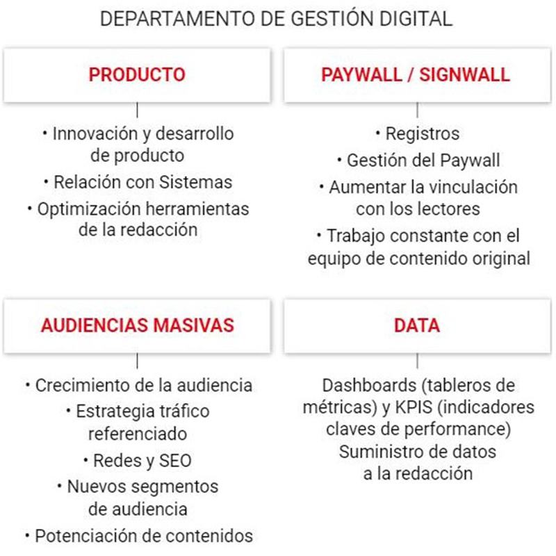 El área de gestión digital editorial, entonces, trabajará sobre cuatro ejes: la innovación y el desarrollo de la web; el vínculo con lectores y suscriptores; el desarrollo de nuevos segmentos de audiencia y estrategias de tráfico referenciado, redes y buscadores; y la incorporación de más mediciones con la sección Big data de Clarín.