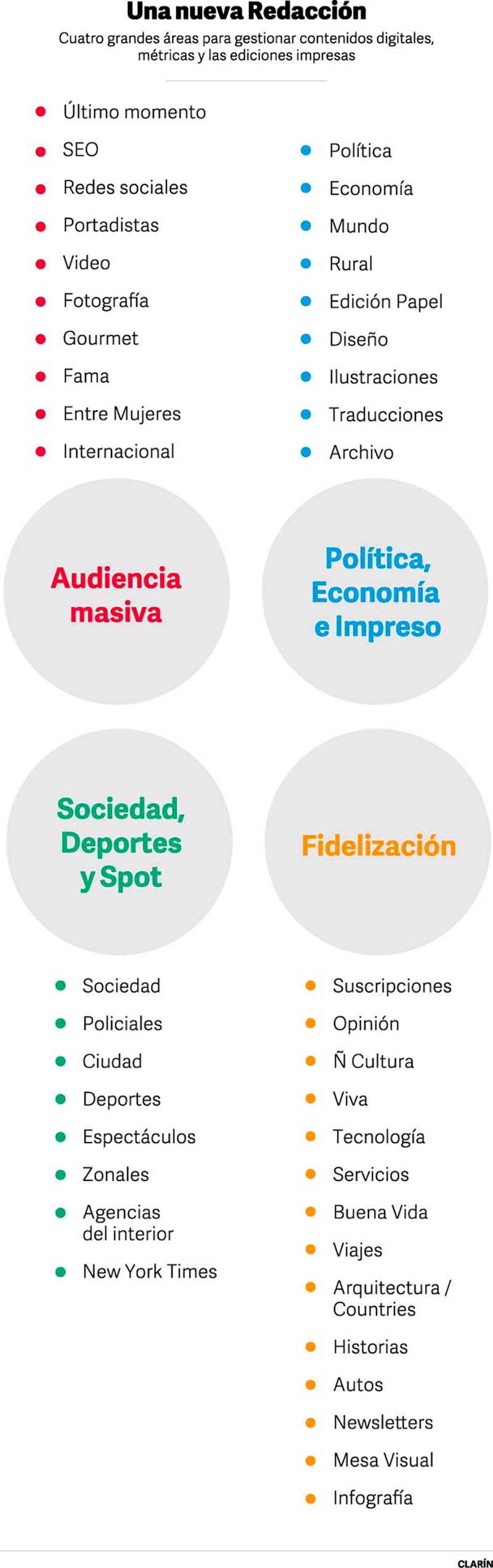 Con los cambios, un equipo de gestión digital supervisará la performance técnica del sitio, la innovación y mejoras en el producto y la experiencia de usuario. También será el interlocutor con las áreas de Sistemas y Comercial. La Dirección de la redacción y la Mesa Central cumplirán una nueva rutina para impulsar activamente la producción periodística.