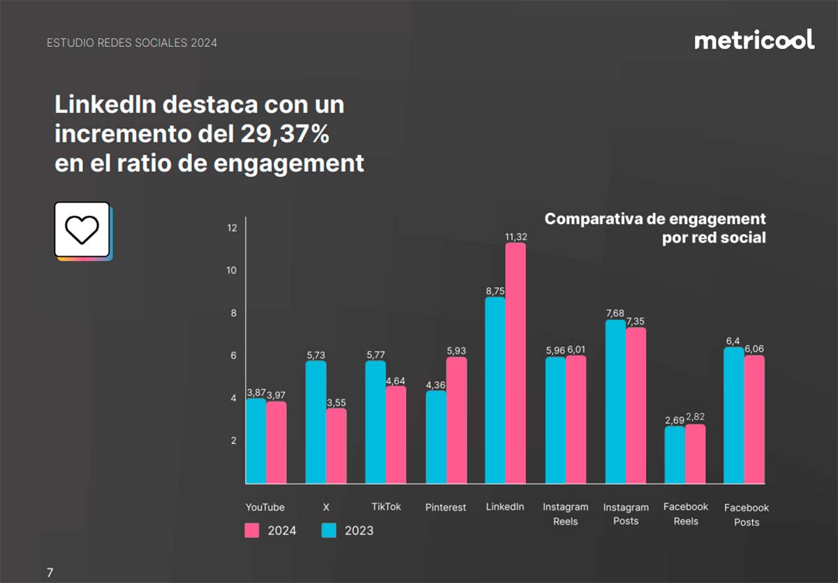 En el caso de LinkedIn, la red ha registrado un incremento del 29,37% en el engagement, consolidándose como una plataforma esencial para la estrategia de contenido profesional. La media de interacciones ha subido, reflejando el valor que los usuarios dan al contenido de calidad en esta red social. LinkedIn sigue siendo la plataforma preferida para el networking profesional y la construcción de relaciones comerciales, con una mayor participación en publicaciones que ofrecen valor y relevancia en un contexto profesional.