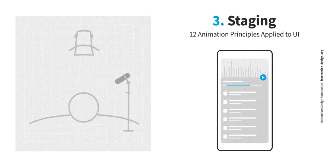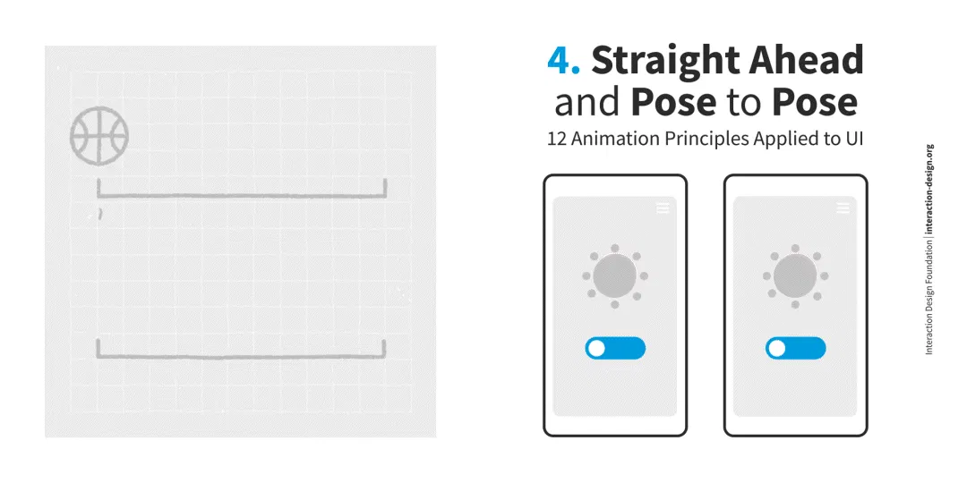 En el caso de la animación de la interface para usuarios puede haber elementos que están relacionados entre sí, pero que pueden moverse a diferentes velocidades. Por ejemplo, una imagen, un título y una descripción. El iniciador del movimiento será el elemento más crucial, en este caso, la imagen. Luego sigue el título y la descripción. Este principio ayuda a establecer una jerarquía en una interfaz.