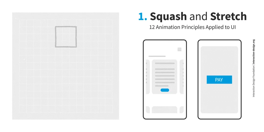 El principio de squash and stretch (estirar y aplastar) hace que los elementos se sientan táctiles y brinda señales visuales o comentarios sobre las posibilidades disponibles. Por ejemplo, si desea que los usuarios se suscriban al periódico, se puede usar el principio de aplastar y estirar para animar el botón de pago y llamar la atención de los usuarios y atraerlos para que «presionen» el botón.
