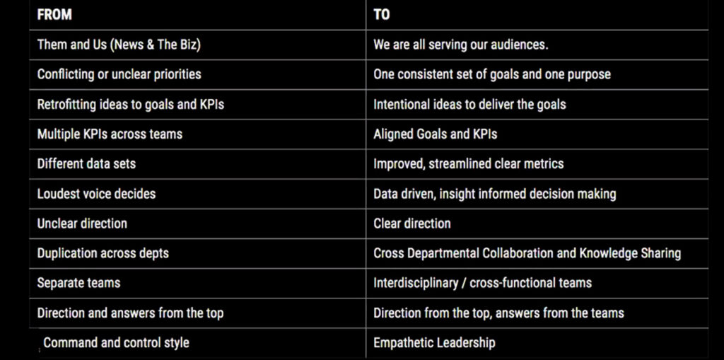 Cuando se abordó cómo empezar a trabajar para impulsar esa cultura de producto -relata Louise Story- «fue necesario definir tanto los objetivos externos como internos; es decir, ajustar tanto nuestro contenido para representar un valor para la audiencia, como internamente cambiar la forma de trabajar. No podíamos seguir trabajando en silos. Una de las razones por las que decidimos implantar el MACU era para integrar esos procesos, unificando, pero respetando las distintas disciplinas y lenguajes».