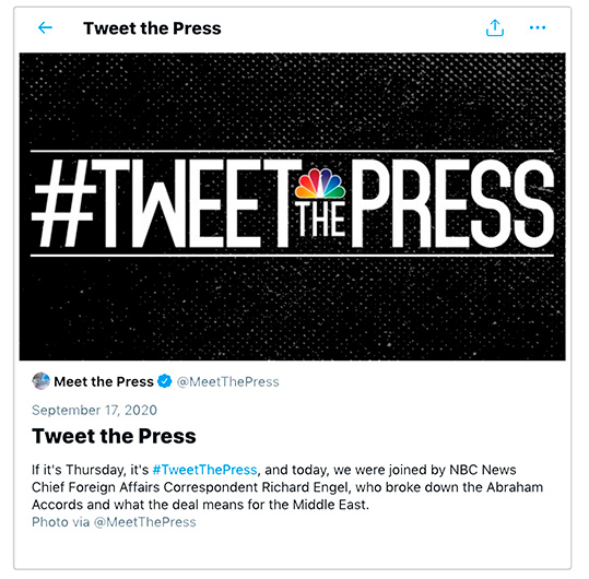 #TweetThePress es una conversación semanal en Twitter que «Meet the Press» mantiene con un periodista de NBC News que cubre la noticia más importante de la semana. El uso de la configuración de «solo las personas que mencionas» permite al público seguir de forma clara y limpia el formato de la conversación.