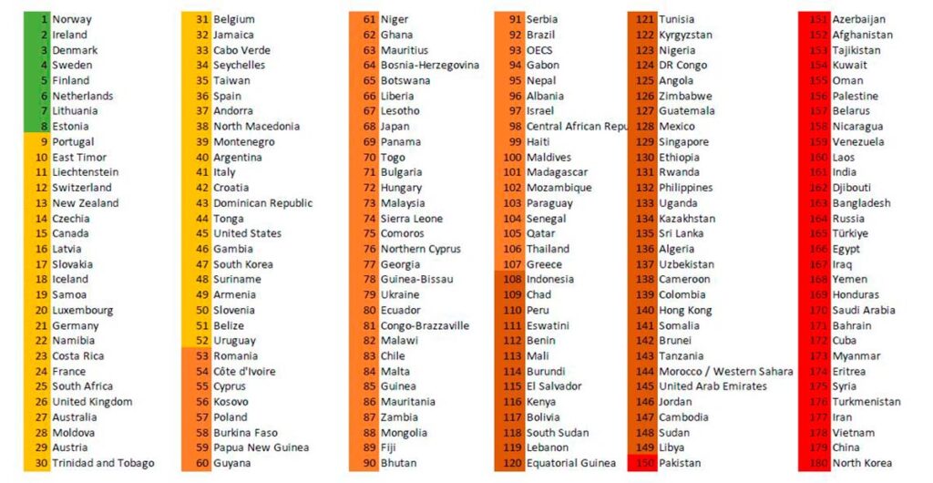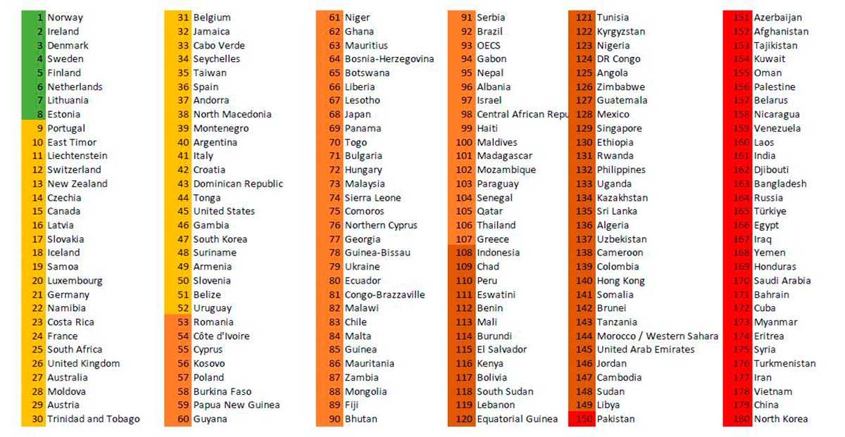 La lista general la encabeza Noruega, seguido de Irlanda y Dinamarca. La Clasificación Mundial de la Libertad de Prensa, evalúa las condiciones en las que se ejerce el periodismo en 180 países y territorios, y se publica cada año el 3 de mayo, Día Mundial de la Libertad de Prensa.
