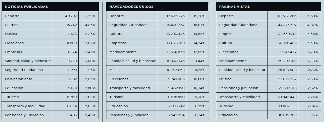 El deporte ha sido la temática más leída, atrayendo a más de 17,6 millones de navegadores únicos y registrando más de 61,5 millones de páginas vistas. Este interés supera al de seguridad ciudadana, sucesos y tribunales, que habían liderado el consumo en el semestre anterior. La música y los temas culturales también siguen siendo de gran interés, aunque desagregados, y se observa un aumento en el consumo de temas relacionados con empresas, comercio y banca.