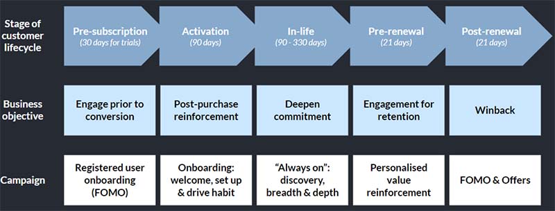Según Financial Times, un programa sólido de CRM es punto de partida y clave para crear y mantener el compromiso que sustenta la lealtad de los suscriptores, así como el aumento del compromiso de los suscriptores en cada punto de su ciclo de vida. A través del CRM, como indica la imagen de abajo, se controla el ciclo de vida del lector, los objetivos en cada etapa, y las acciones y campañas asociadas a la consecución de ese compromiso.