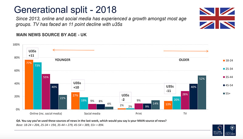 «La mayoría de los datos que he recopilado con un equipo de personas en el Instituto Reuters provienen del Digital News Report, nuestra encuesta anual sobre el uso de noticias en 38 mercados diferentes en los cinco continentes, principalmente en Europa. Cuando preguntamos a las personas cuál es su principal fuente de noticias, aproximadamente el mismo número de personas dice online y televisión. En algunos países, la televisión está ligeramente por delante y en otros, lo online está un poco por delante. Pero, en términos generales, vemos un patrón muy similar en línea y televisión bastante por delante de la prensa y la radio».