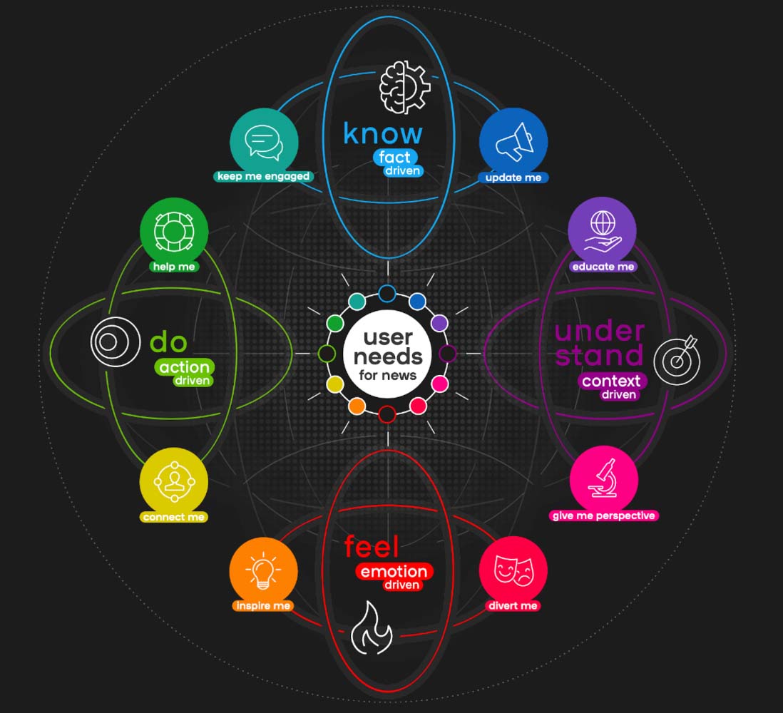 El modelo de necesidades del usuario de noticias, diseñado para la BBC por Dmitri Shishkin en 2017, es un esquema si no básico, si fundamental a la hora de crear estrategias de fidelización de lectores y convertirlos en suscriptores, o retener a los que ya son suscriptores, aplicado por numerosos medios en todo el mundo.