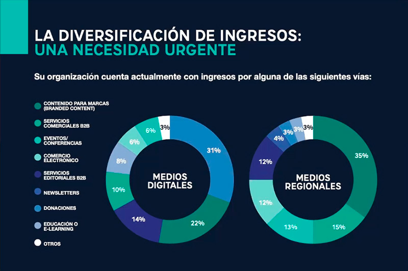 En el desglose de ese escaso porcentaje de ingresos que no proceden de publicidad o ingresos por lector sobresalen, en el caso de los medios regionales, los ingresos por branded content, los servicios comerciales B2B, los eventos y el comercio electrónico; y en el caso de los medios digitales, ese 8% de ingresos alternativos se corresponde mayoritariamente con donaciones, branded content, servicios comerciales B2B y eventos y conferencias.