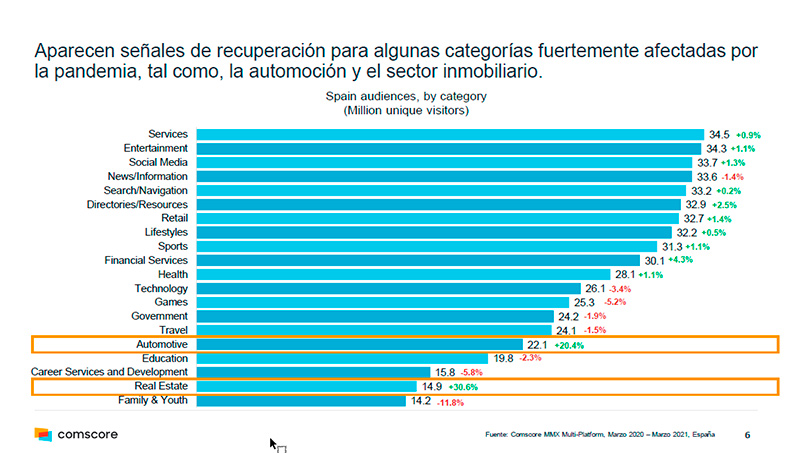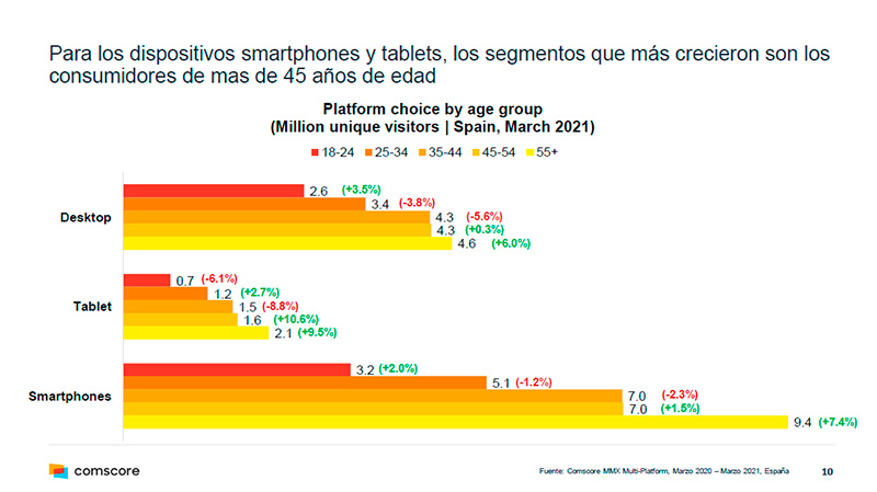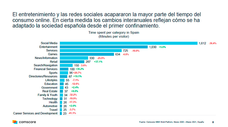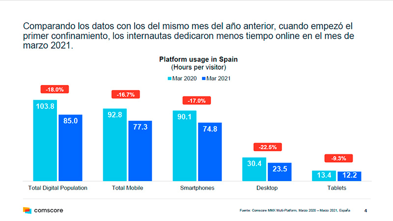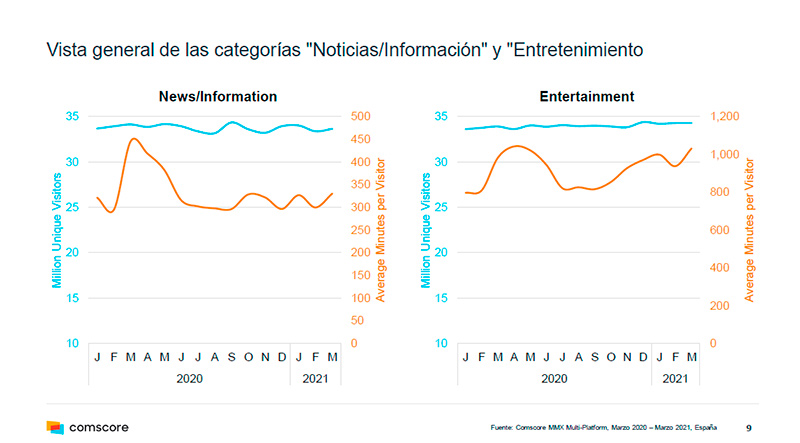 Es la primera vez que se dan datos interanuales en Comscore (marzo de 2020/marzo de 2021), y permiten ya medir la tendencia a un año vista, desde que arrancó la pandemia por coronavirus.