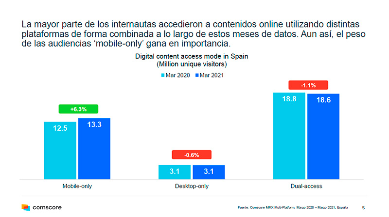Uno de los datos que se desalinean de, por ejemplo, la radiografía de Gran Bretaña, es el de las plataformas desde las que se accede online. Sin en Gran Bretaña se registró un crecimiento positivo del acceso dual, esto es, desde el ordenador y desde el móvil, de un 1,6%, en España no ha sido así, y el acceso dual retrocede un 1,1%, mientras que el acceso sólo desde móvil crece un 6,3% en marzo de 2021 con respecto a marzo de 2020.