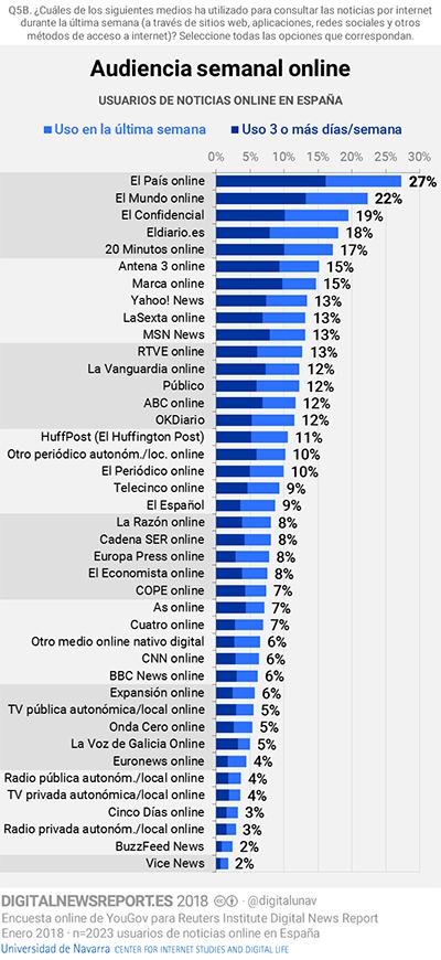 Según el Digital News Report 2018, las marcas informativas más consultadas en digital en España, son, en los primeros cinco puestos, El País, El Mundo, El Confidencial, Eldiario.es y 20 minutos. Les siguen, del sexto al décimo puesto, Antena 3, Marca, Yahoo, LaSexta y MSN.