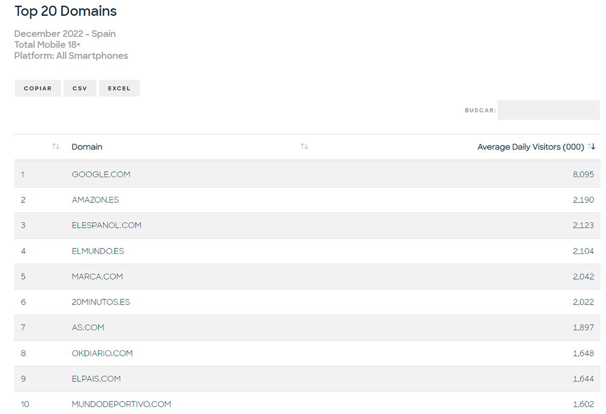 La tercera posición es para Marca.com, seguido de 20minutos.es y de As.com. Algunos periódicos que logran mejores clasificaciones en el tráfico conjunto, en esta clasificación de tráfico desde móvil quedan algo descolgados, como Elpais.com, que se queda en 1,64 millones de usuarios diarios de media procedentes desde móvil. La clasificación, no obstante, no la encabezan periódicos digitales, sino Google y Amazon.