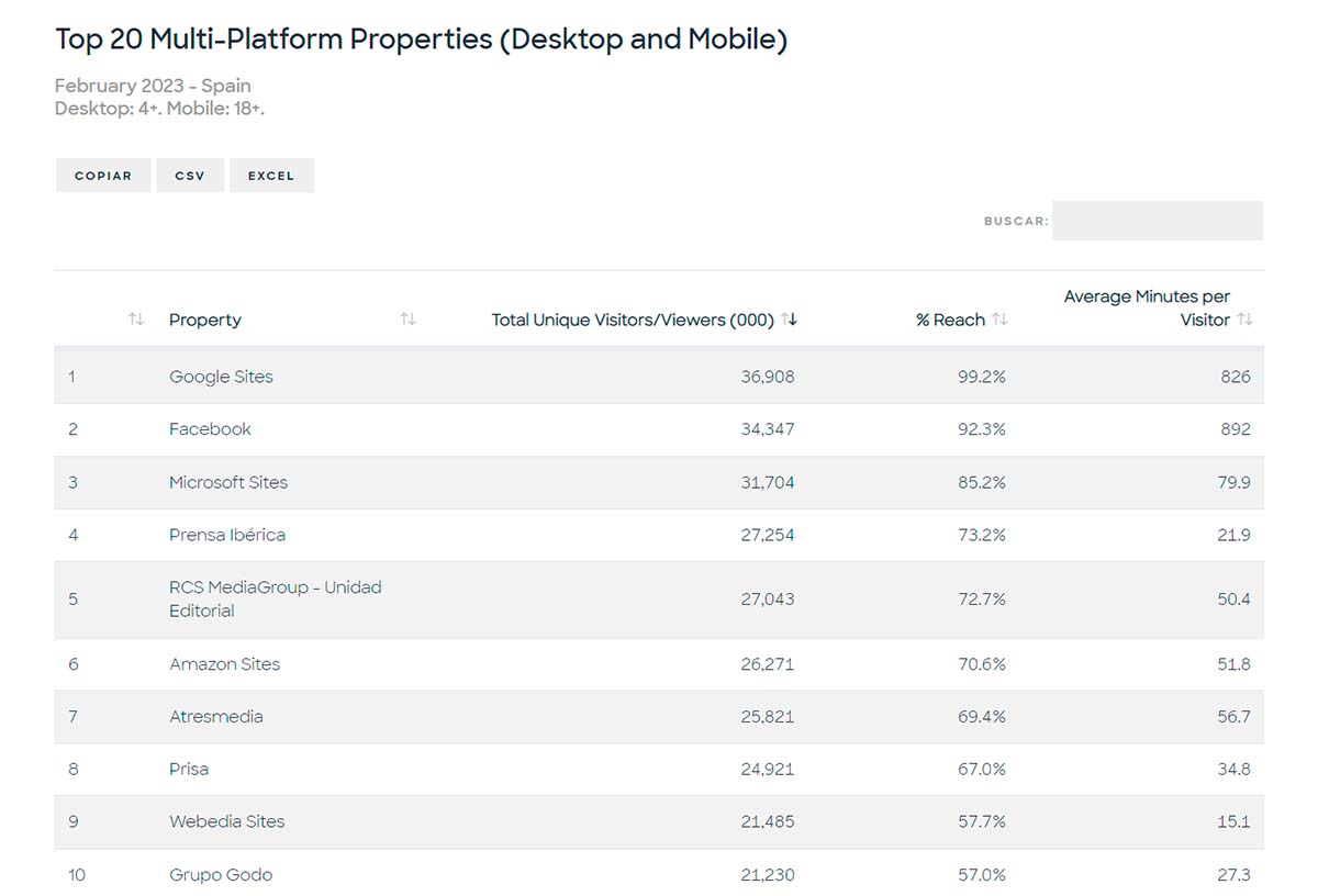 Por grupos de comunicación, en totales, sumando tanto tráfico de móvil como de ordenador de escritorio, (en este caso, datos de febrero pasado) Prensa Ibérica lidera el ranking, con 27,2 millones de usuarios únicos mensuales, seguido de RCS Mediagroup – Unidad Editorial, con 27 millones, seguido de Atresmedia y Prisa.