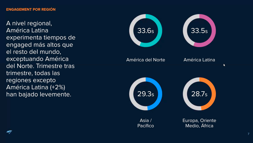 Con respecto al tiempo promedio por región, Latinoamérica fue una de las pocas zonas en las que creció el engagement (+2%), y experimenta tiempos de engagement más altos que el resto del mundo, exceptuando América del Norte.