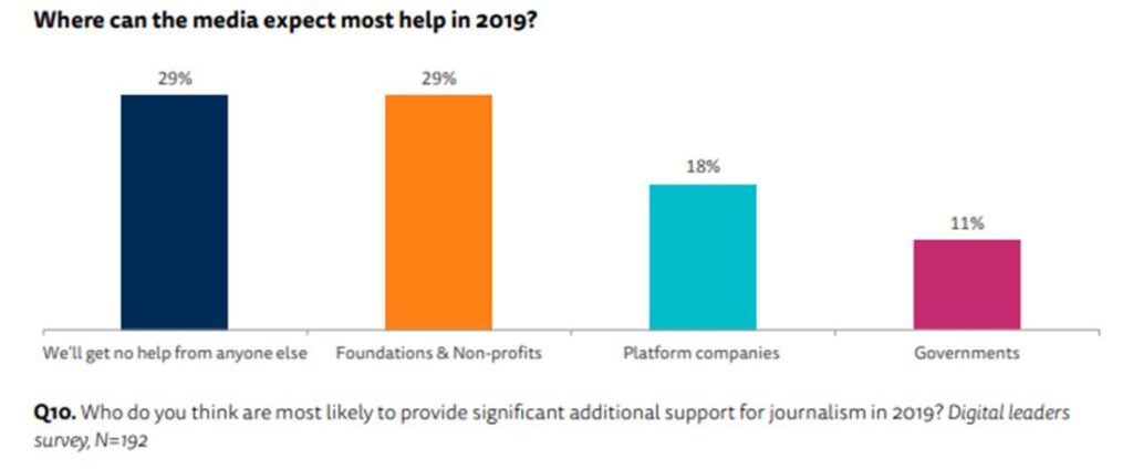 - Al mismo tiempo, parece haber una aceptación creciente de que algunos tipos de información de calidad van a necesitar ser subsidiados. Casi un tercio (29%) espera que este año sean significativas las ayudas de fundaciones y organizaciones sin fines de lucro, y una quinta parte (18%) espera que las plataformas tecnológicas contribuyan más, mientras que uno de cada diez (11%) cree que los gobiernos brindarán más apoyo al periodismo de calidad. Sin embargo, el 29% de los encuestados no espera que ninguno de los anteriores actores vaya a ir a su rescate.