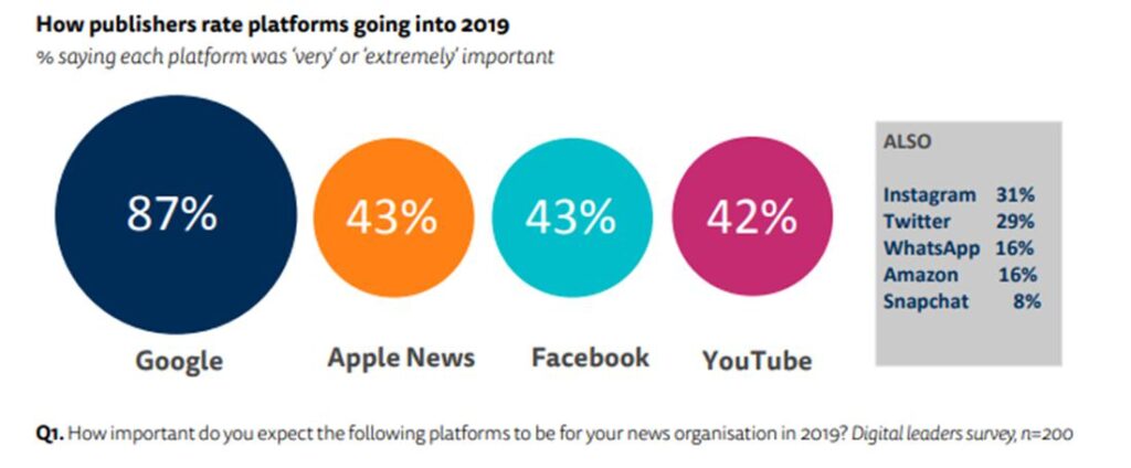 - La industria de los medios está perdiendo la paciencia con Facebook y los editores están volviendo a enfocar su atención en otro lugar. Menos de la mitad de los encuestados (43%) dice que la plataforma es probable que sea importante o extremadamente importante este año, un número similar al de Apple News y YouTube, pero mucho menos que para Google (87%).