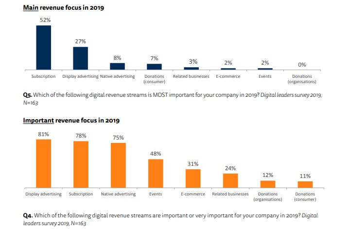 - La suscripción y la membresía son la prioridad clave para los medios de comunicación. La mitad de los encuestados (52%) espera que éste sea el foco principal de ingresos en 2019, en comparación con solo el 27% que opina que el foco principal seguirá siendo la publicidad en display, un 8% que considera que será la publicidad nativa y un 7% que cree que lo que más crecerá serán las donaciones. «Este es un gran cambio de enfoque para la industria de los medios de comunicación».