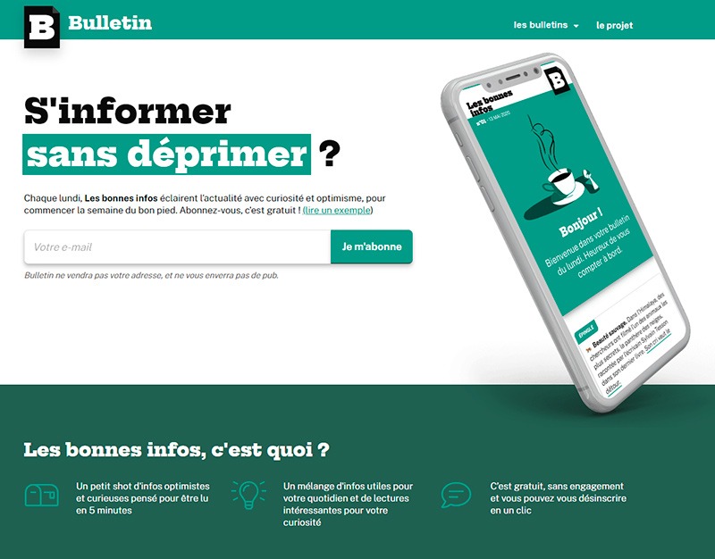 Bulletin.fr «nació de una observación -indican sus impulsores-: la necesidad de los lectores de disponer de un periodismo más optimista y de información menos angustiosa, que no se limite a los trágicos acontecimientos de Francia, los trastornos económicos, las enfermedades y epidemias que aparecen en la portada del diario, sino que vaya más allá, y que, además, dé motivos de esperanza y compromiso en temas como paridad, clima, solidaridad, etc.».