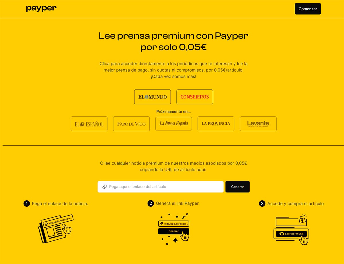 Además de acceder directamente a cada periódico que esté en el servicio, los que se den de alta pueden también copiar la URL del artículo deseado e ir a la plataforma de Payper para generar un enlace de pago y proceder a la compra del contenido.