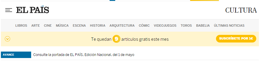 A las 00:00 de este Primero de Mayo ha entrado en funcionamiento el muro de pago del periódico español El País. Aunque la puesta en marcha del modelo de suscripción de pago estaba prevista para hace semanas, los directivos del periódico de Prisa anunciaron que se posponía la medida hasta mayo por la crisis del coronavirus. Poco después de las 12 de la medianoche, el periódico de la calle Miguel Yuste ha anunciado en su web que arranca el nuevo modelo.