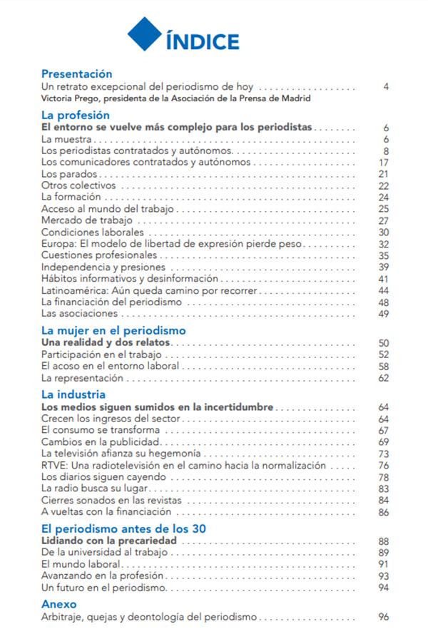 En el informe, la presidenta de la APM, Victoria Prego, indica: «Entre los autónomos, la figura del periodista que trabaja para varias empresas es cada vez mayor y llega en este 2018 a situarse en el 50%, lo cual es una prueba más de que los precios que se pagan por las colaboraciones, lo mismo que los salarios, están cayendo en demasiadas ocasiones por debajo del nivel de la proletarización de este oficio. Esa es una realidad que están padeciendo muchos de nuestros compañeros y la inmensa mayoría, por no decir la totalidad, de los periodistas jóvenes.»