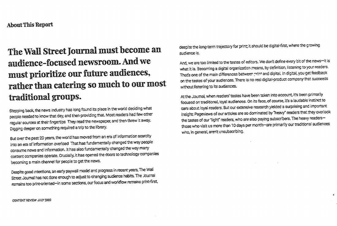 El informe, que una persona del WSJ confirmó que fue enviado a algunos editores pero no a toda la redacción, sostiene que muchos de los periodistas del Wall Street Journal no entienden Internet ni los intereses de los nuevos lectores y siguen centrando su contenido en temas de interés para una audiencia mayor en lugar de tratar de entender en la forma y el fondo a una audiencia cada vez más joven, y que es necesaria para su supervivencia.