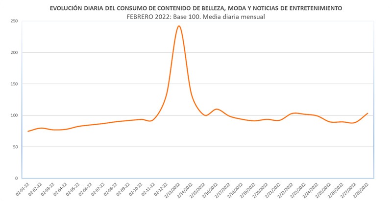 Como se observa en el gráfico inferior, el día 13 de febrero el consumo de este contenido se sitúa un 82% respecto al día anterior y muy por encima del promedio del mes.