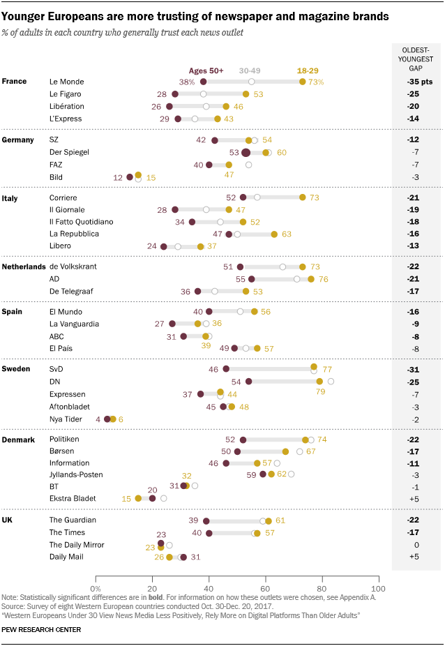Por ejemplo, en Francia, los más jóvenes confían en cada una de las cuatro marcas de periódicos a las que se les preguntó: Le Monde, Le Figaro, Libération y L’Express, más que los del grupo de mayor edad. Estas brechas en la confianza pueden ser sustanciales, ya que las personas más jóvenes confían en al menos 14 puntos más de cada una de estas fuentes que las personas mayores de 50 años. En el caso de Le Monde, hay una brecha de 35 puntos porcentuales en la confianza; casi tres cuartos de los 18-29 (73%) confían en la marca, en comparación con el 38% de los mayores de 50 años.