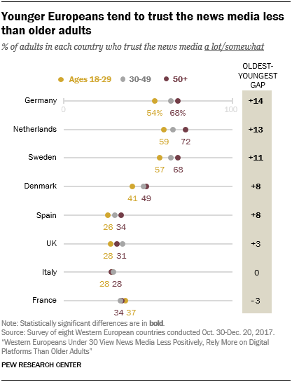 En Alemania, un 54% de los jóvenes de entre 18 y 29 años confía en los medios de comunicación, cifra que alcanza hasta un 68% en los mayores de 50 años. En los Países Bajos, un 72% de los mayores de 50 años confía en los medios de comunicación, la cifra más alta de todo el estudio.