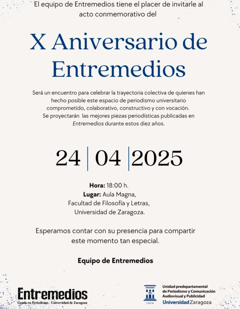 El Aula Magna de la Facultad de Filosofía y Letras de la Universidad de Zaragoza acogerá mañana el acto conmemorativo por los diez años de actividad de Entremedios, el medio de comunicación impulsado por el alumnado del Grado en Periodismo de la institución. El evento, que comenzará a las 18.00 horas, reunirá a estudiantes, docentes, autoridades académicas y profesionales vinculados al proyecto durante la última década.
