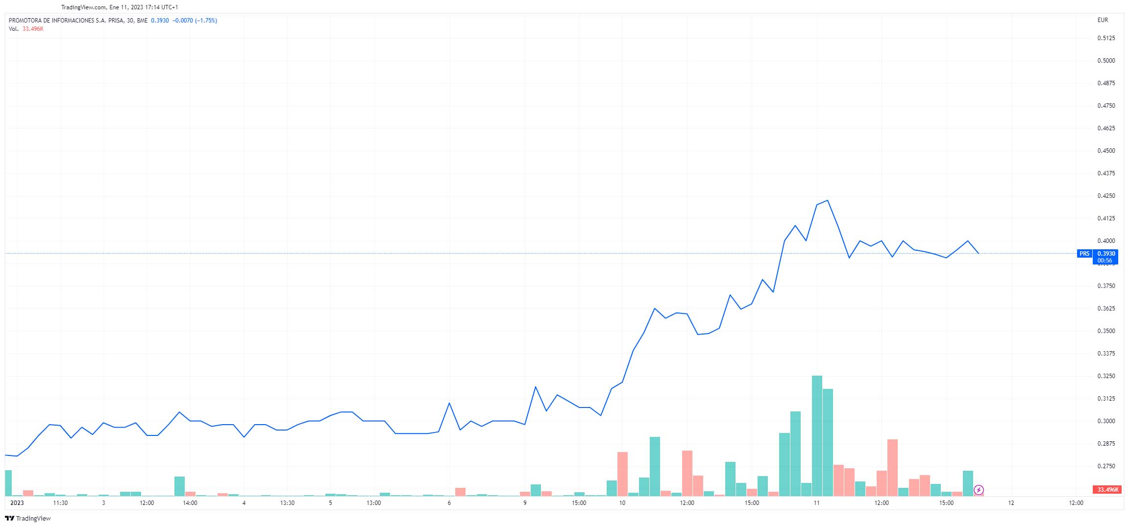Las acciones de Prisa han registrado desde el arranque del año una revalorización superior al 25%, llegando a cotizar por encima de los 0,42 euros en algunos momentos. La media móvil simple de las últimas 50 semanas es de 0,3245 euros y algunos días en las últimas 52 semanas, se llegó a cerrar la sesión a 0,271 euros por acción. Ayer, al cierre de la sesión, cotizaba en torno a los 0,39 euros la acción.