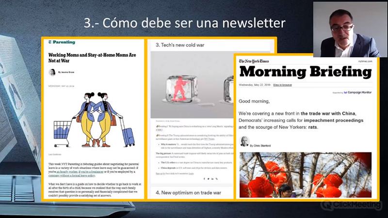 En el webinar se abordó la estrategia que debe seguirse, que parte, a juicio de Cucarella, por establecer en primer lugar, claramente, qué objetivos queremos conseguir, y una vez determinados los objetivos, se procede a analizar qué contenido, convertido en newsletter, con qué voz, y qué estructura, puede cumplir ese objetivo.