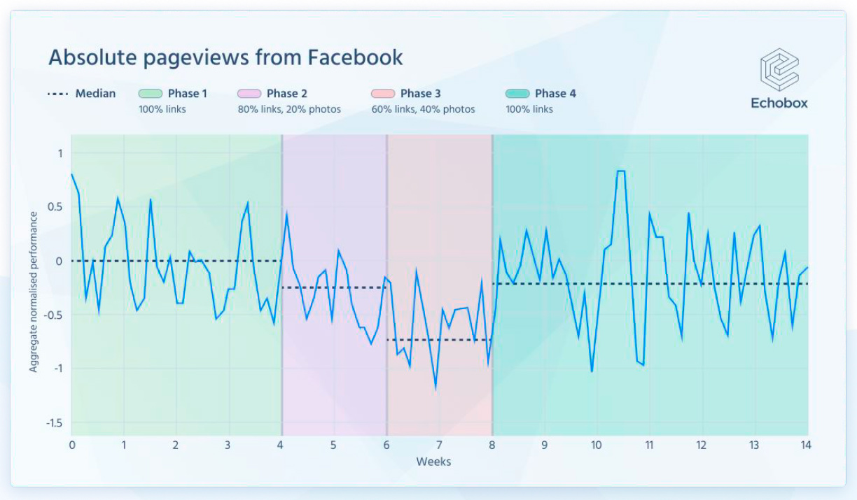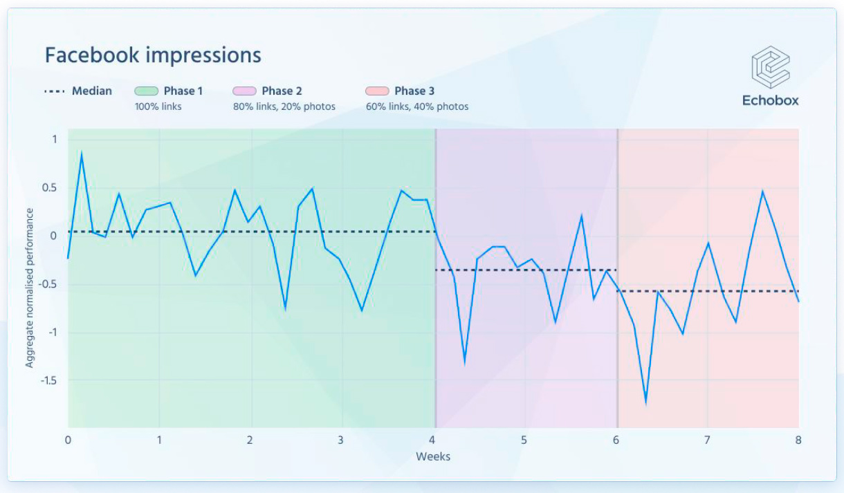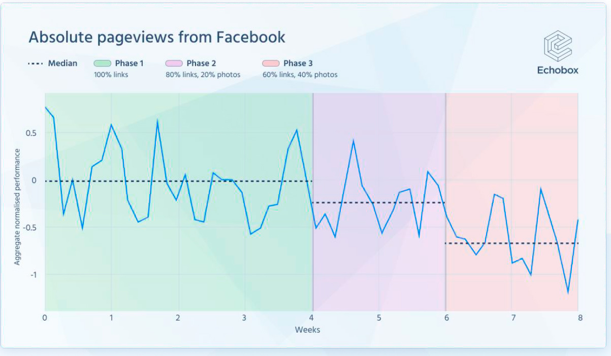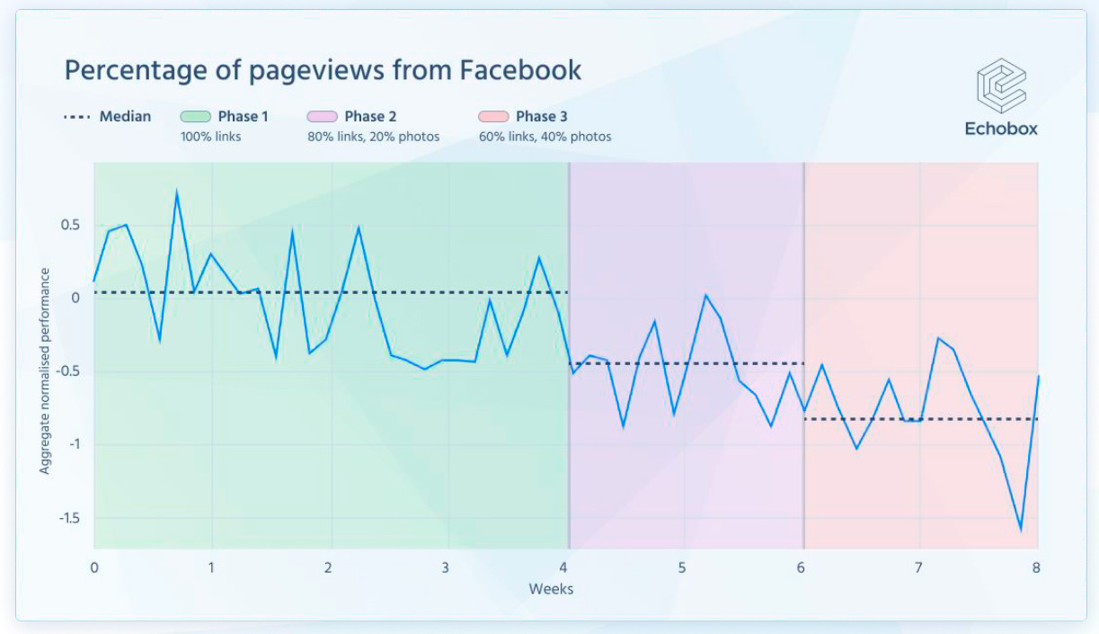 El estudio arrojó que la introducción de fotonoticias enlazadas tuvo un impacto negativo en el rendimiento. En la Fase 2, cuando el 20% de las acciones compartidas fueron publicaciones de fotos, las cuatro métricas disminuyeron, y las mayores caídas se produjeron en el porcentaje de páginas vistas de Facebook y las impresiones de Facebook. Este impacto negativo se hizo aún más pronunciado en la Fase 3, ya que el porcentaje de publicaciones con fotos aumentó del 20% al 40%.