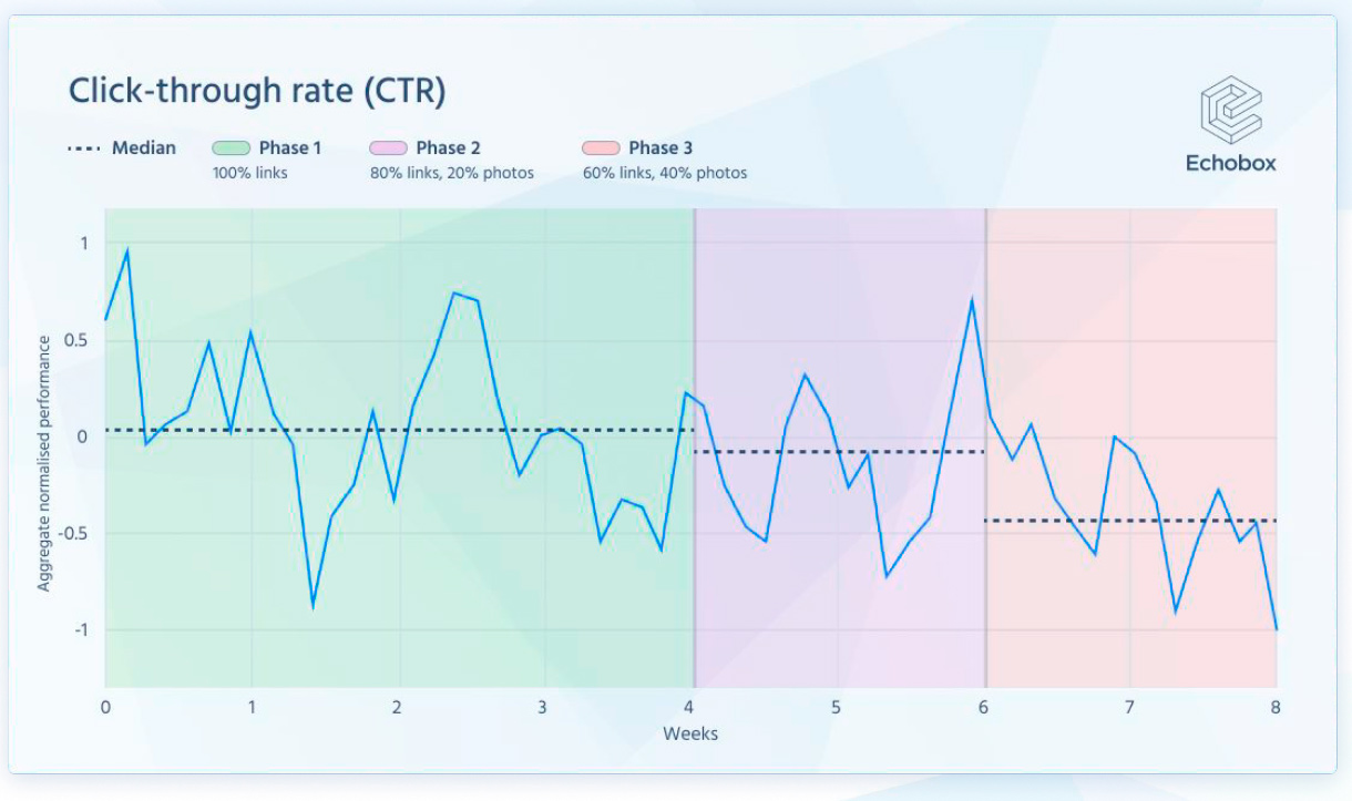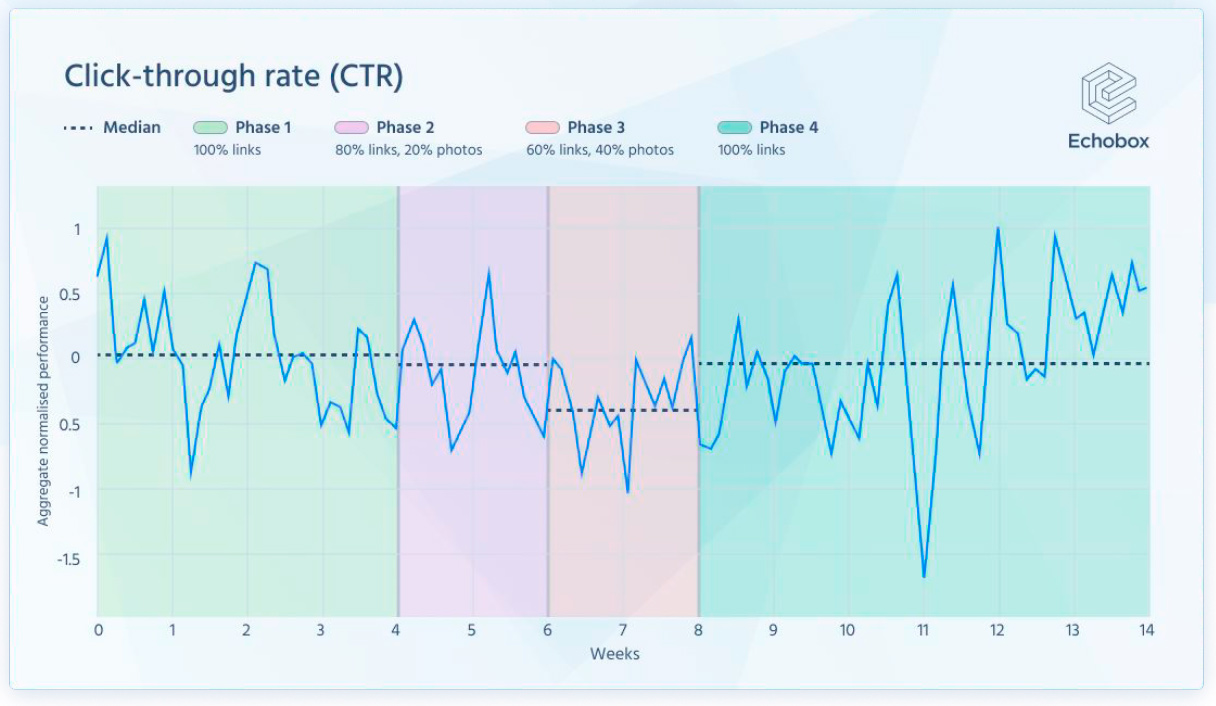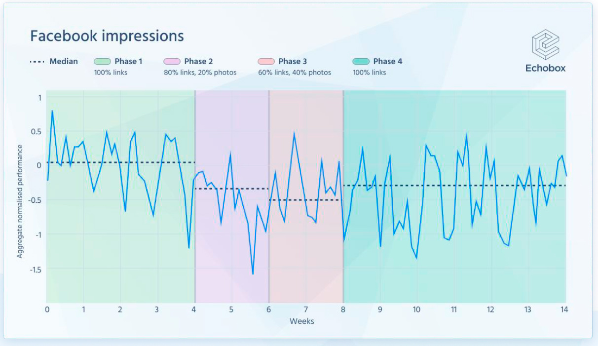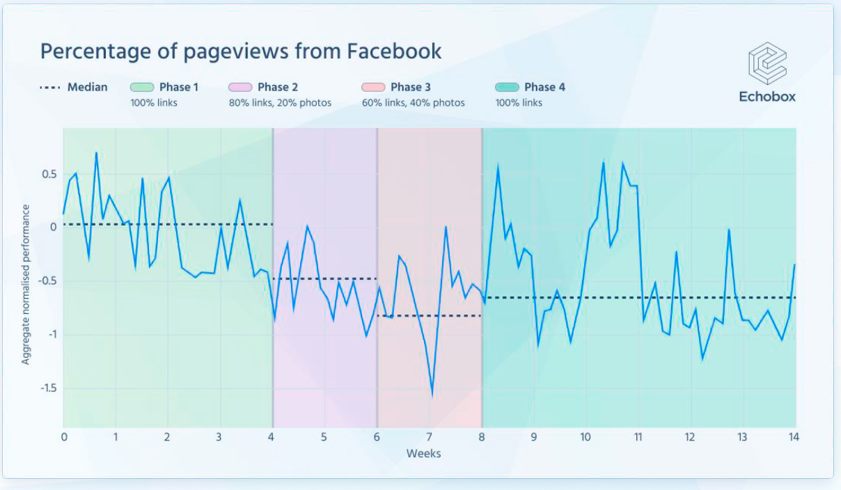 El estudio arrojó que la introducción de fotonoticias enlazadas tuvo un impacto negativo en el rendimiento. En la Fase 2, cuando el 20% de las acciones compartidas fueron publicaciones de fotos, las cuatro métricas disminuyeron, y las mayores caídas se produjeron en el porcentaje de páginas vistas de Facebook y las impresiones de Facebook. Este impacto negativo se hizo aún más pronunciado en la Fase 3, ya que el porcentaje de publicaciones con fotos aumentó del 20% al 40%.