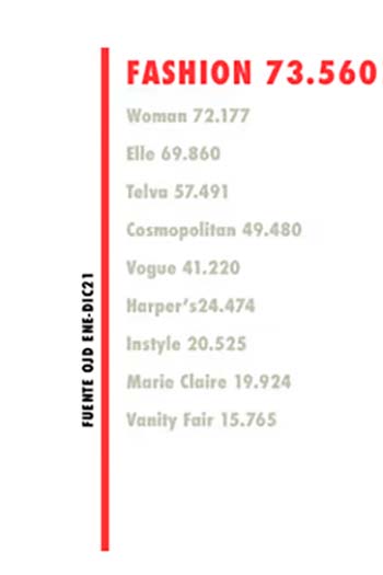 La revista Fashion, del grupo ¡Hola!, especializada en moda, se ha convertido en la publicación mensual femenina más vendida, según los últimos datos de la OJD, la entidad encargada de medir la difusión de los medios impresos, ha indicado ¡Hola! en un comunicado. Los datos, indica el grupo editor, corresponden a los meses de enero a diciembre de 2021.