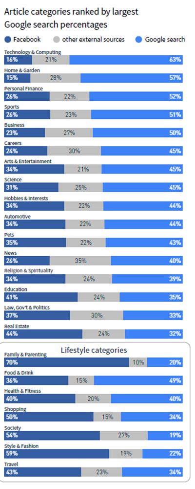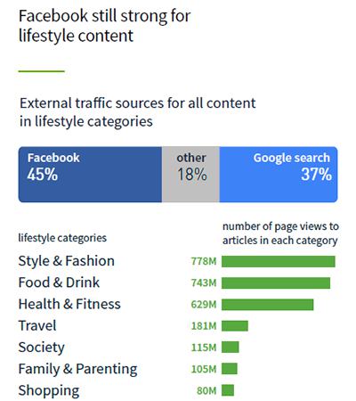 Facebook, por contra, sigue siendo la principal fuente de tráfico de referencia para el contenido de estilo de vida en la actualidad. De hecho, de todas las categorías con un mayor porcentaje de tráfico de Facebook, solo tres no formaban parte del grupo de estilo de vida. Familia, comida y bebida, salud, compras, sociedad, estilo y moda y viajes son las categorías en las que Facebook va delante de Google como motor de envío de tráfico a los medios de comunicación. En temas de familia (cuidado de los hijos, etc.), la diferencia entre Facebook y Google alcanza su máximo expresión, con un 70% a favor de la red social y sólo un 20% para el buscador, repartiéndose el otro 10% el resto de redes sociales.